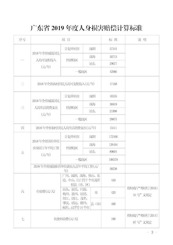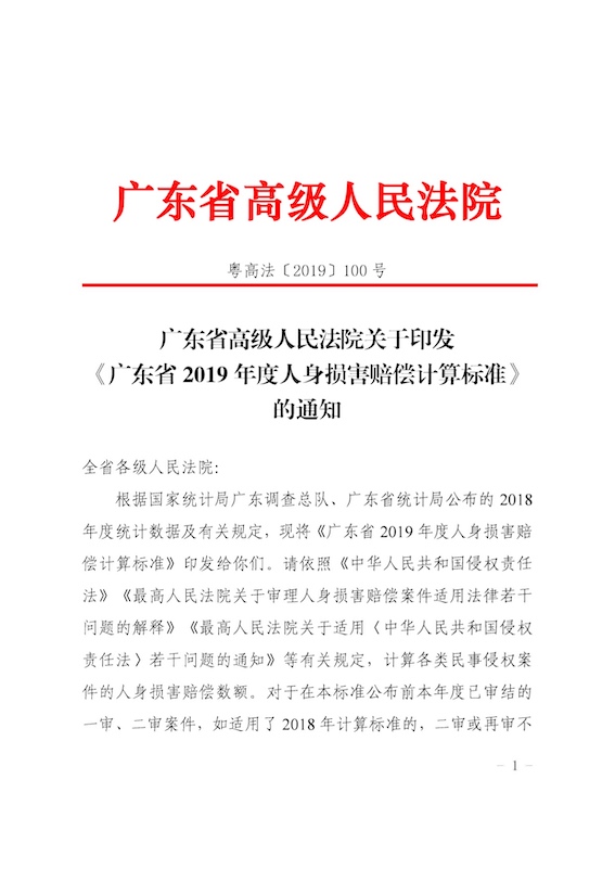 廣東省高級人民法院關于印發《廣東省2019年度人身損害賠償計算標準》的通知