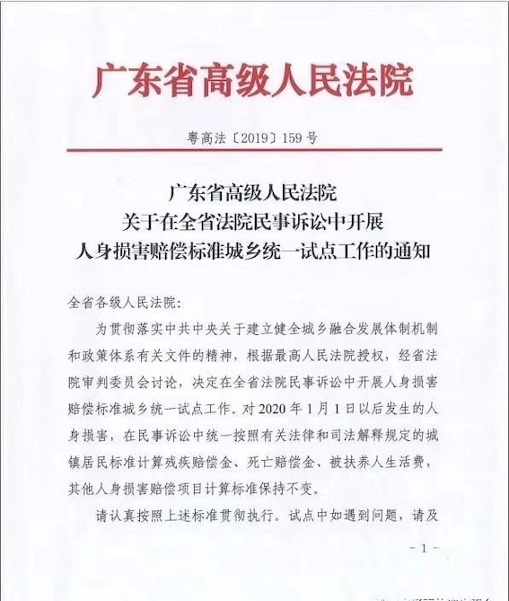 廣東省高級(jí)人民法院關(guān)于在全省法院民事訴訟中開(kāi)展人身?yè)p害賠償標(biāo)準(zhǔn)城鄉(xiāng)統(tǒng)一試點(diǎn)工作的通知