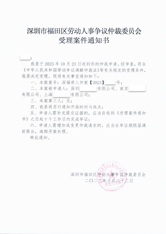 勞動人事爭議仲裁委員會出具的《受理案件通知書》 |