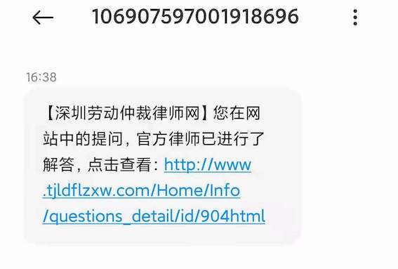 ·手機號——可自行選擇填與不填。由于律師并非時時在線,而且如果因為開庭或者被其他事情耽擱,很可能會較晚回復。因此,如果填寫手機號碼,那么在律師作出回復時提問者就能第一時間收到短信通知(見下圖)。