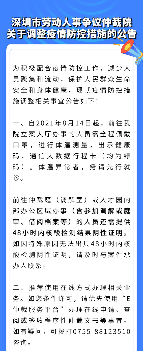 深圳市勞動人事爭議仲裁院關于調整疫情防控措施的公告(二)(2021-08-30)