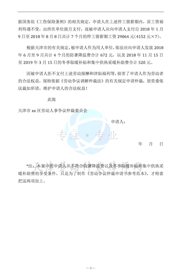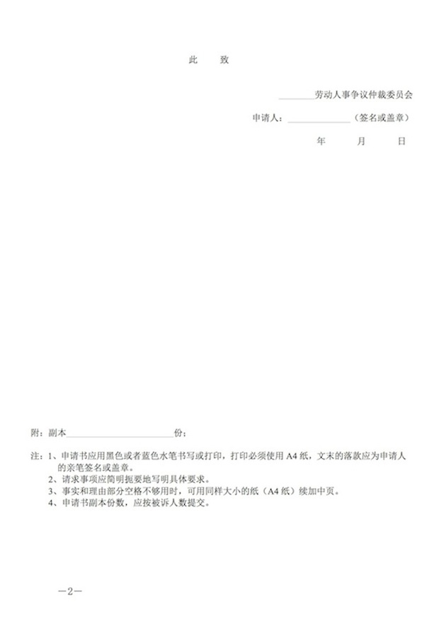 需要說明的是,天津市各勞動仲裁委對于《申請書》的要求是不一樣的。比如,對于圖2參照《民事起訴狀》的格式寫成的《申請書》,有的勞動仲裁委是不收的,而只收圖1的制式文本。又如,有的勞動仲裁委對于“要求用人單位支付違法解除勞動合同的賠償金”的仲裁請求,會要求刪掉“違法”二字。諸如此類情況,只能是按照管轄的勞動仲裁委的要求提交或者填寫《申請書》,因為根據《勞動人事爭議仲裁辦案規則》的規定,“對于仲裁申請書不規范”的,勞動仲裁委有權要求申請人補正材料,而何為“規范”,法律、法規均無規定,于是便由各勞動仲裁委自己掌握。同時,《勞動人事爭議仲裁辦案規則》雖然沒有規定如果申請人拒不按照要求補正材料會有什么后果,但倘若勞動仲裁委據此以不符合受理條件為由對仲裁申請不予受理,那申請人也是沒有相應的救濟途徑的,只能是跳過勞動仲裁程序直接向法院提起訴訟。
