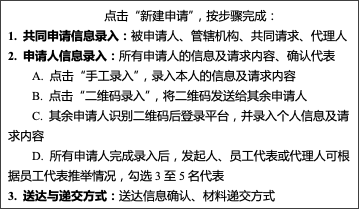 2.集體爭議申請由員工代表或代理人發起創建、錄入共同信息及完成最后提交。申請人可通過掃描平臺生成的二維碼加入該集體爭議,也可由員工代表或代理人代為錄入。在平臺提交集體爭議仲裁申請前,各申請人可點擊本人姓名修改本人信息,也可由員工代表或代理人進行修改。