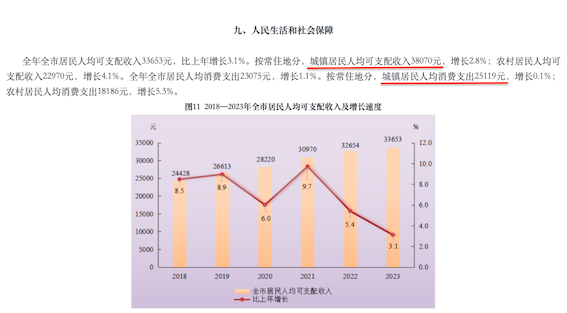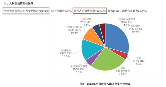 2、2023年深圳市城鎮居民人均可支配收入和城鎮居民人均生活消費支出,來自深圳市統計局于2024年4月28日發布的《深圳市2023年國民經濟和社會發展統計公報》第九章人民生活和社會保障。