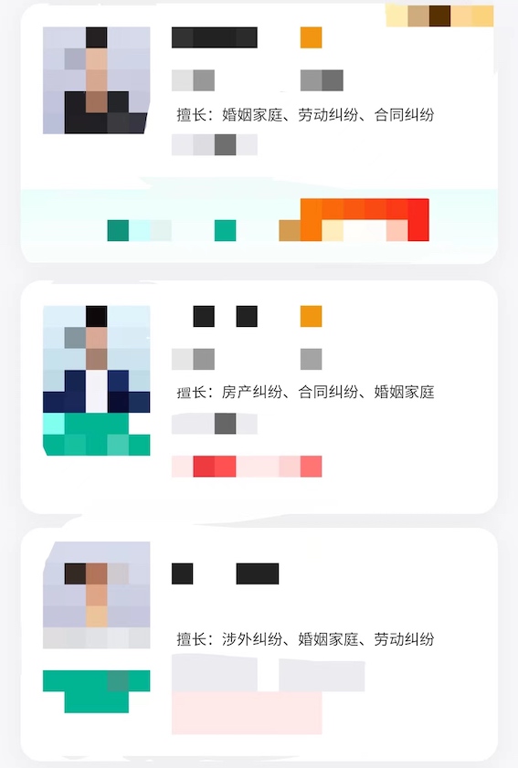 而像下圖,第一個,把“婚姻家庭”放在第1位,說明可能是婚姻法律師,兼做勞動法的業務。第二個,應該是不做勞動法業務的。第三個,勞動法業務在一個很次要的位置。