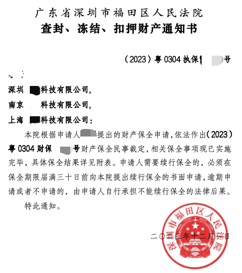 福田法院受理了我們提出的財產保全申請后,分別凍結了深圳時尚科技公司銀行賬戶內存款25萬元、上海時尚科技公司銀行賬戶內存款25萬元以及南京時尚科技公司銀行賬戶內存款0元。后法院經過詢問我們的意見,對上海時尚科技公司和南京時尚科技公司的賬戶進行了解封,而只凍結深圳時尚科技公司的賬戶存款。