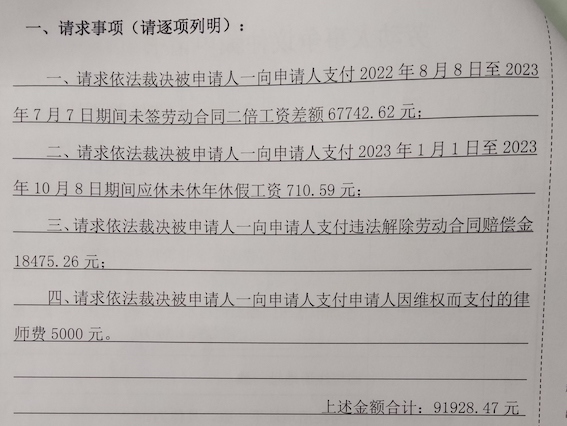 一、請求依法裁決被申請人向申請人支付2022年8月8日至2023年7月7日期間未簽勞動合同二倍工資差額67742.62元;