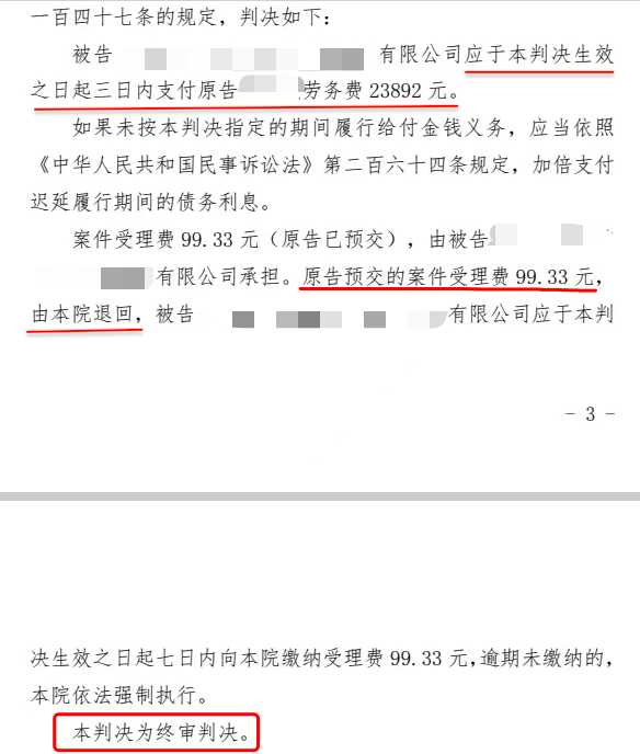 最終,龍崗法院適用小額訴訟程序實行一審終審,對該案作出終審判決,其實是在我們的意料之中的,因為根據《民事訴訟法》第165條的規定,基層人民法院和它派出的法庭審理事實清楚、權利義務關系明確、爭議不大的簡單金錢給付民事案件,標的額為各省、自治區、直轄市上年度就業人員年平均工資百分之五十以下的,適用小額訴訟的程序審理,實行一審終審。也就是說,實行一審終審需要同時符合兩個條件:第一,必須是事實清楚、權利義務關系明確、爭議不大的簡單金錢給付民事案件;第二,標的額為各省、自治區、直轄市上年度就業人員年平均工資百分之五十以下(2022年度深圳市在崗職工年平均工資為164754元,50%則為82377元)。應該說,本案是符合適用小額訴訟程序審理的條件的,一方面,標的額僅為23892元;另一方面,證據還算充分,事實比較清楚。當然,盡管如此,我們還是向法院提交了一份先予執行申請書,向法院申請裁定先予執行該筆勞務費。結果法官沒有批準我們的申請,但聲稱會在春節前解決,于是在1月18日庭審結束以后,1月25日便作出判決了,而且是終審判決(亦即深圳某建筑工程公司不可以再向深圳市中級人民法院提起上訴),相當神速。